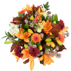 Gleaming in soft, indirect light as if resting in a window along Wood Green's bustling streets, this bouquet of Gerbera daisies sweeps the eye with its blend of vivid oranges, sunflower yellows, and lush fuchsia blooms. Each petal is smooth and satiny, radiating energetically outwards from a gorgeous, near-black center. The addition of leafy green sprigs provides refreshing contrast and softens the vibrant colours, echoing the greenery of nearby parks like Ducketts Common. The hand-tied bouquet is expertly wrapped-first in rustic brown kraft paper, then in a shimmery cone of cellophane that hugs the shape while offering gentle structure. Its stems, neatly cut and gathered, are visible through a classic glass vase filled with clean water, showcasing the freshness that locals have come to expect from Wood Green florists. Finished with a simple brown twine and a white tag, complete with a red rose emblem, the arrangement feels personal and inviting, perfect for celebrations, thank-you gestures, or spontaneous surprises delivered to doorsteps on Station Road. The balance of depth, colour, and texture suggests a lively yet thoughtful moment, as vibrant as the community it serves.