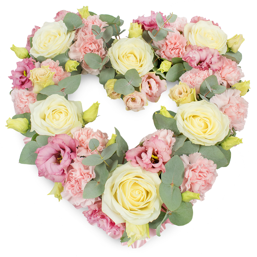 Honor cherished memories with our elegant open heart memorial bouquet. This stunning arrangement features a harmonious mix of white roses, tender pink carnations, delicate pink lisianthus, and aromatic eucalyptus leaves, beautifully arranged to symbolize love and remembrance.